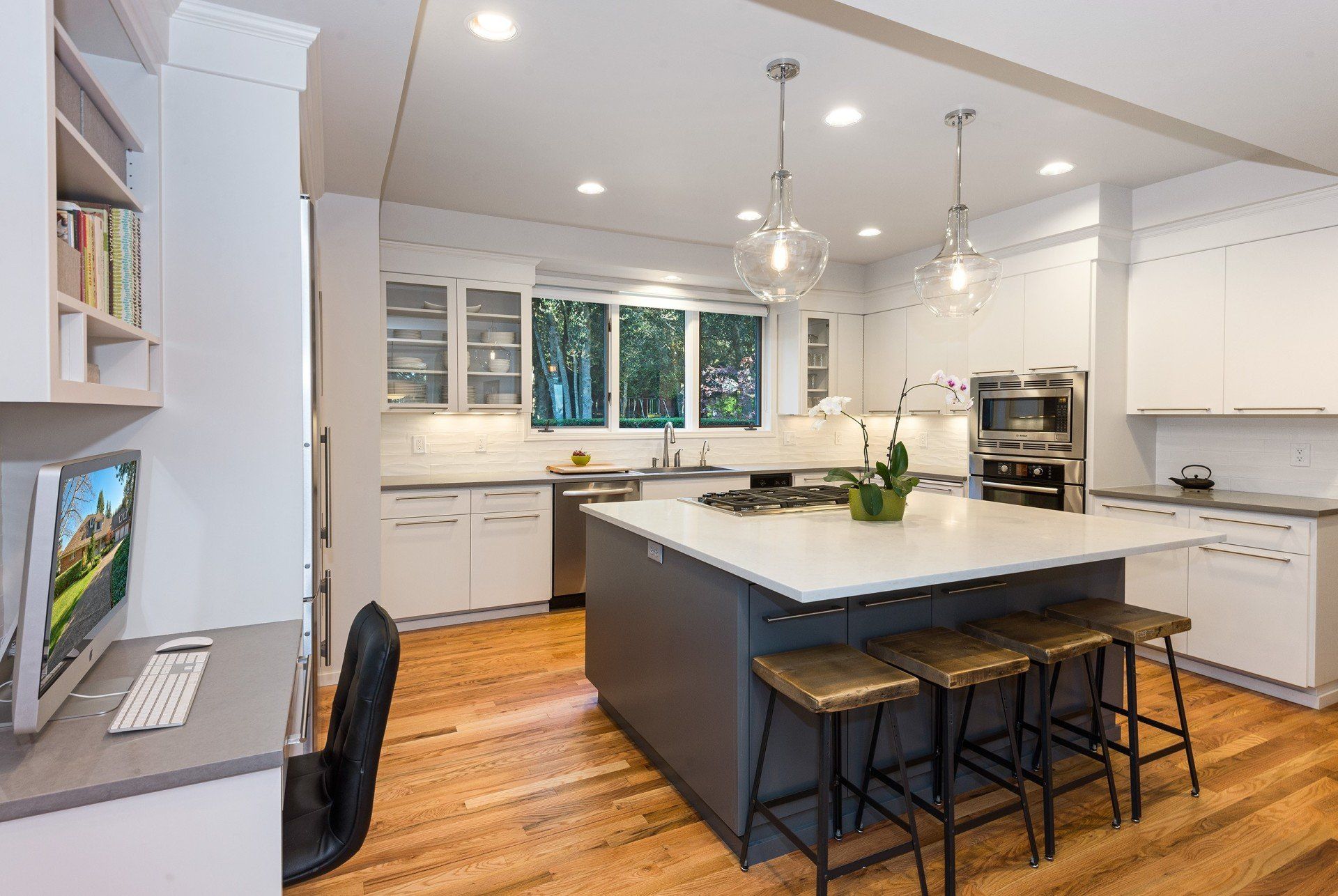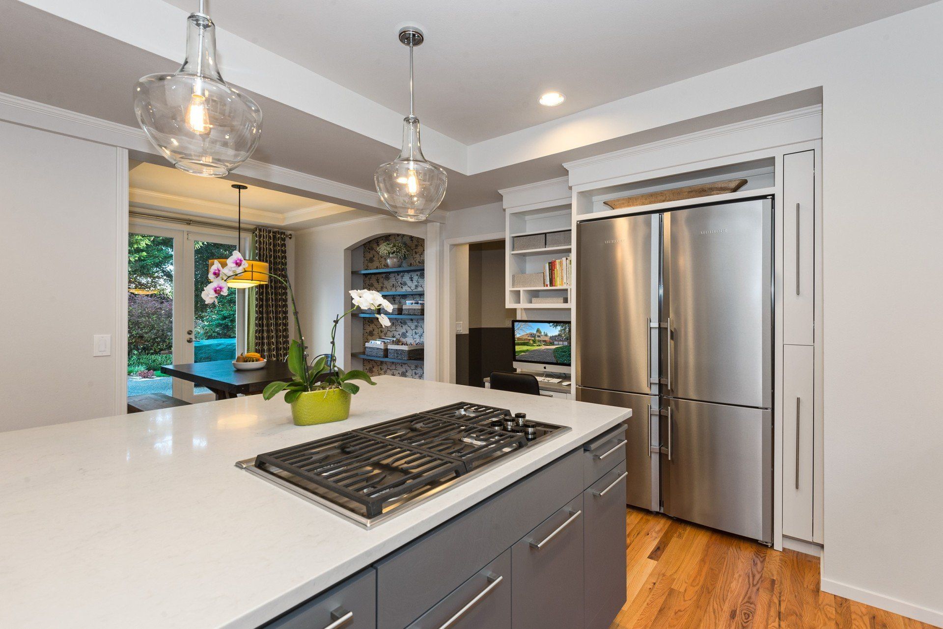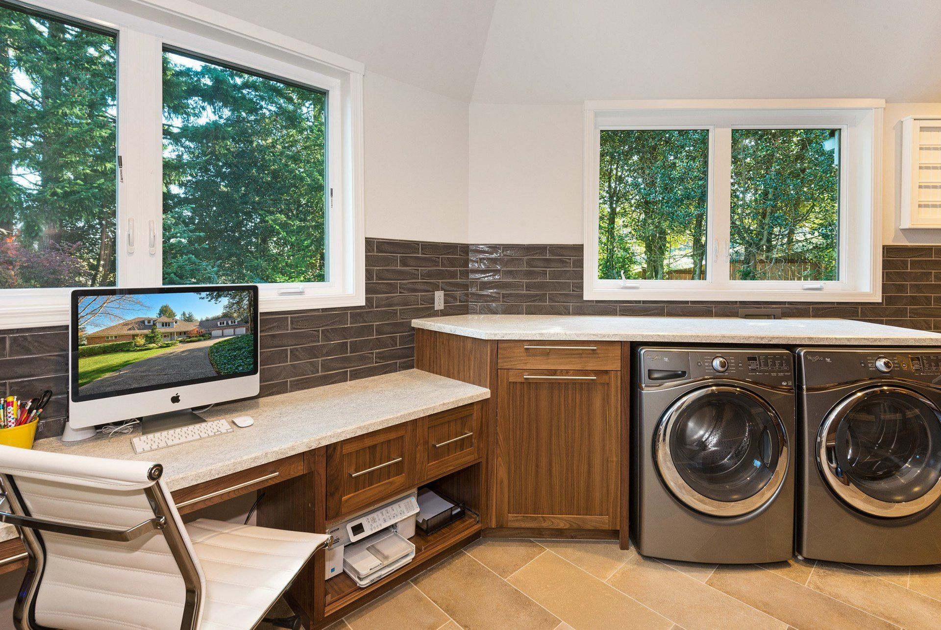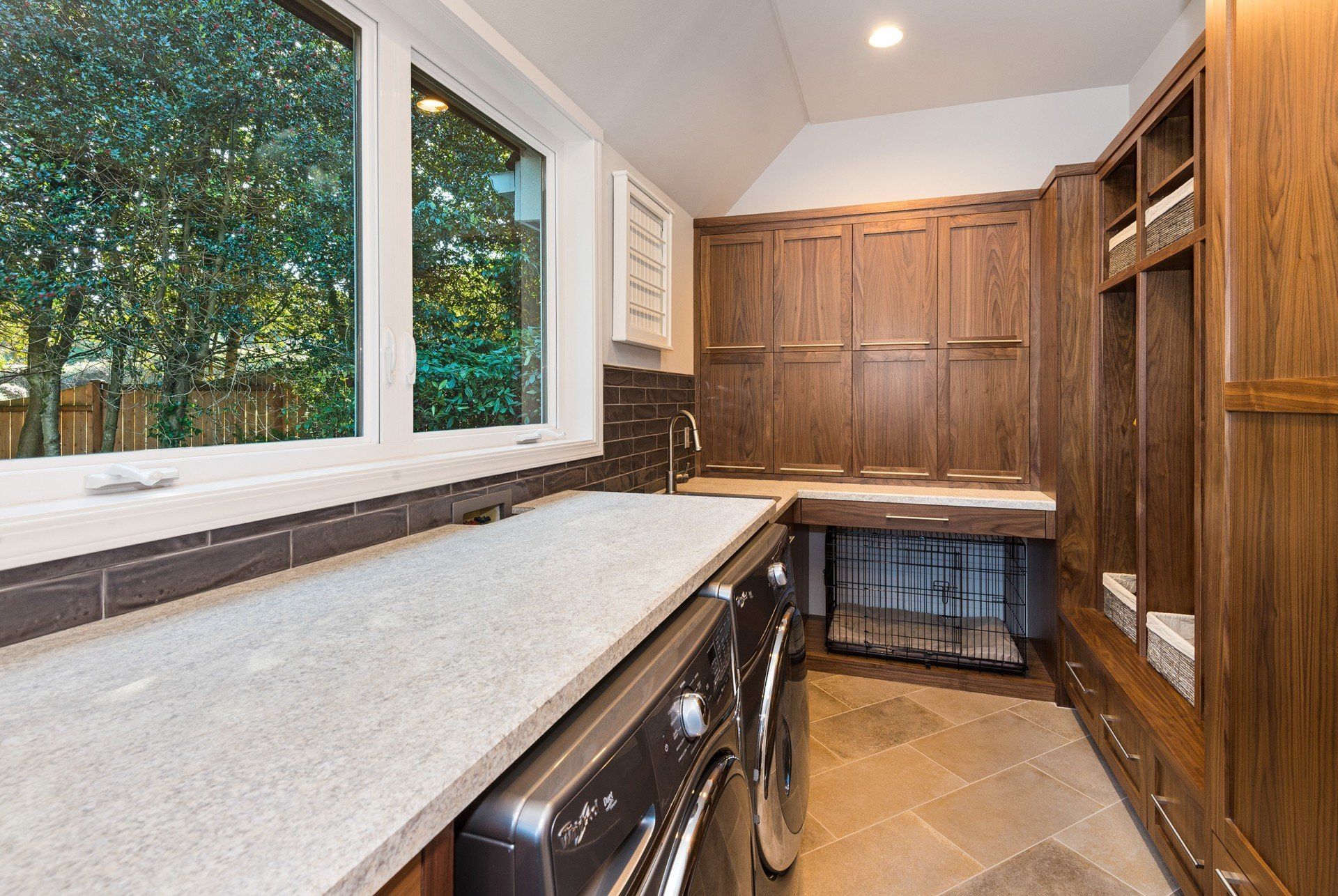 In the kitchen, we only removed one wall of cabinetry to house a much larger side by side all refrigerator, all freezer. The remaining cabinets received new slab door and drawer fronts, a wonderful paint job which started with filling all the oak grain to disguise it’s origins and crisp white paint. On the island, we reversed the contrast and used deep gray paint on the cabinets and a white quartz countertop. New hardware, modern appliances and fun accents in a warm gray and apple green color scheme round out the changes. In the laundry, walnut cabinetry is customized to fit the clients’ needs perfectly, including homework stations for the children, a sewing corner, integrating the dog crate seamlessly into the design and hiding the cat box. We took our time to determine exactly how the clients’ would use the space and gave them everything on their wish list. The result, in the kitchen and laundry, is a bright, functional and above all else, modern space – just what the clients’ asked for!
