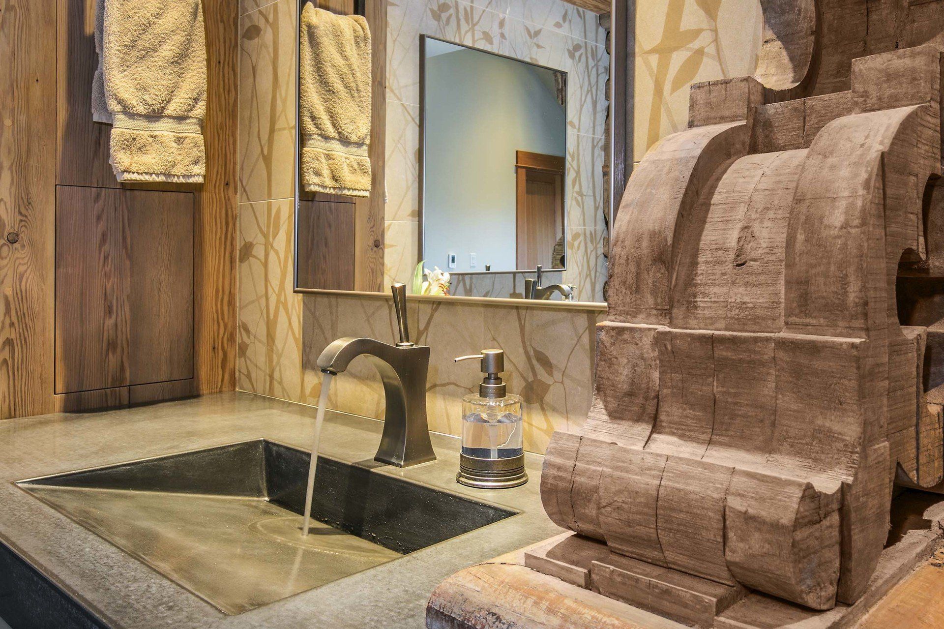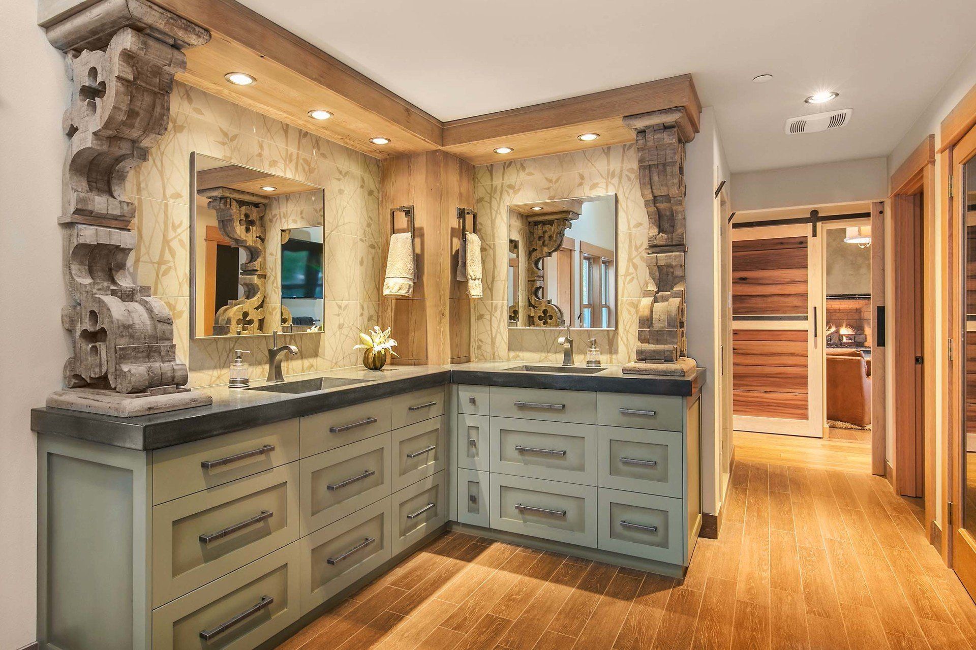 My clients had outgrown their builder’s basic home and had plenty of room to expand on their 10 acres. Working with a local architect and a talented contractor, we designed an addition to create 3 new bedrooms, a bathroom scaled for all 3 girls, a playroom, gymnasium, outdoor pool, tennis and basketball courts. Each child’s room was designed around their preference of color scheme and each girl has a unique feature that makes their room truly their own. The oldest daughter has a secret passage hidden behind what looks like built in cabinetry. The youngest daughter wanted to “swing”, so we outfitted her with a hanging bed set in front of a custom mural created by a Spanish artist. The middle daughter is an elite gymnast, so we added monkey bars so she can cruise her room in style. The girls’ bathroom suite has 3 identical “stations” with abundant storage. Cabinets in black walnut and peacock blue, white quartz countertops and an Opal white marble backsplash are durable and beautiful. Two shower stalls, designed with a colorful and intricate tile design, prevent bathroom wait times and a custom wall mural brings a little of the outdoors in.