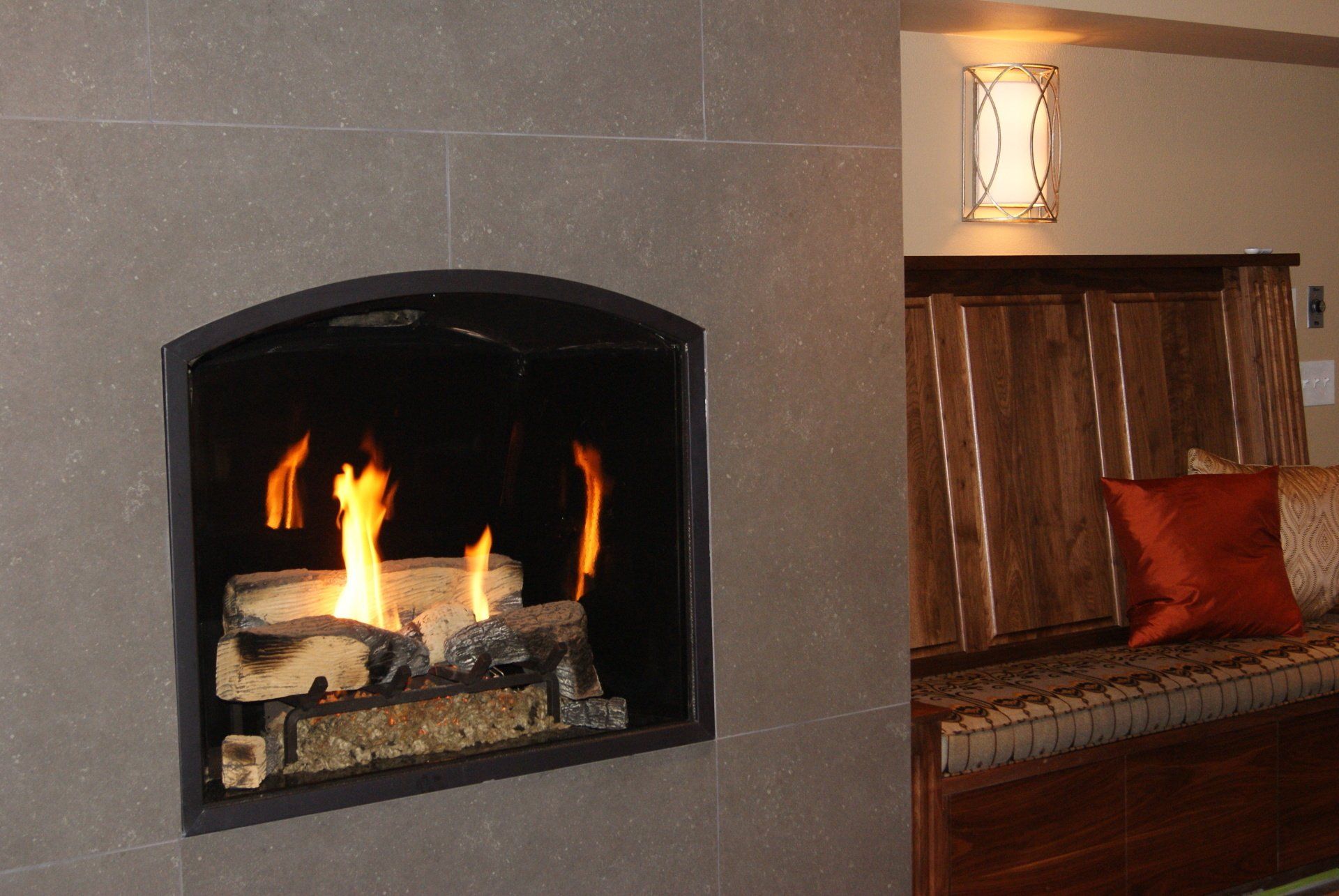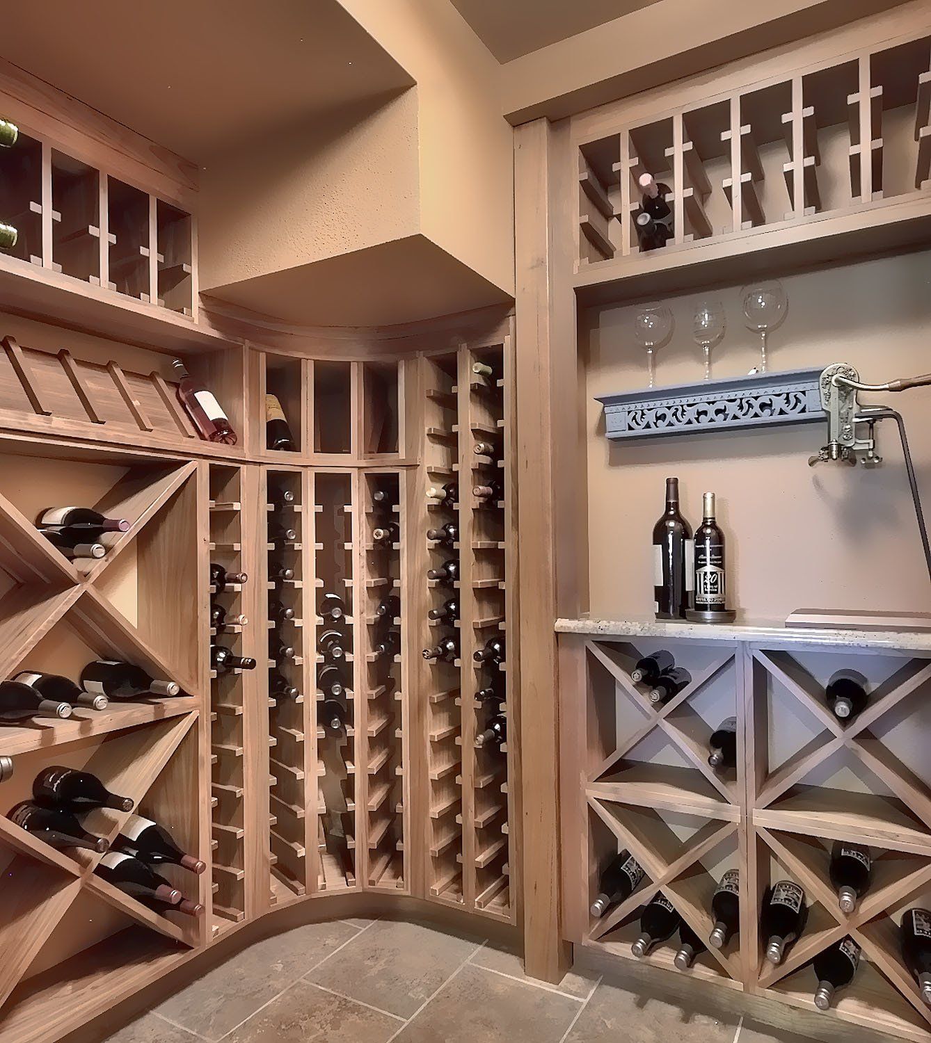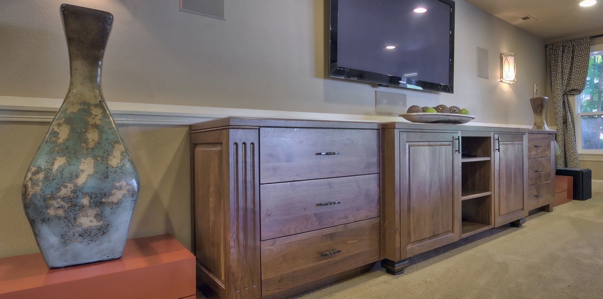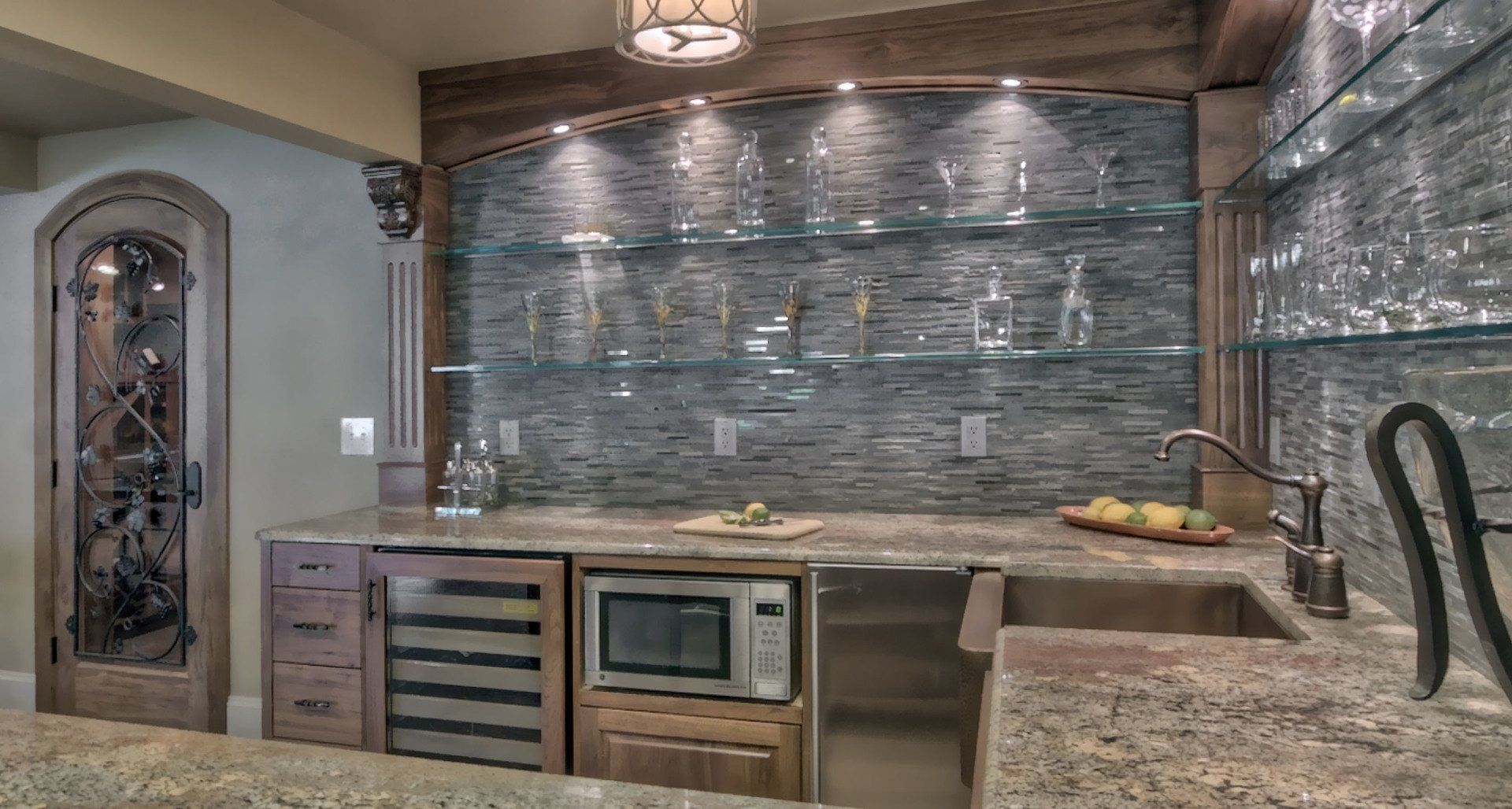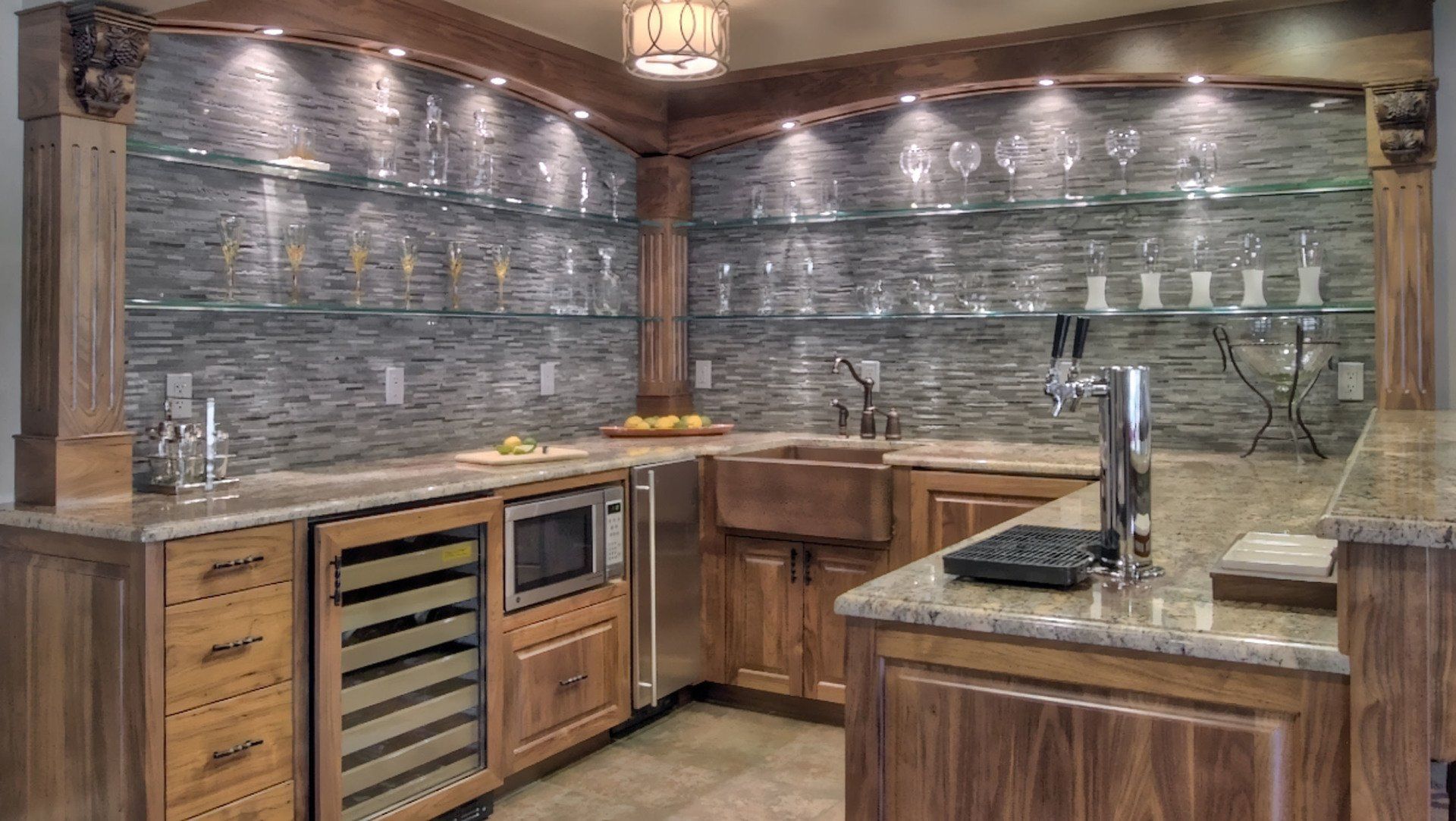We added a full entertainment kitchen, featuring a wine captain, keg refrigerator, refrigerator drawers, dishwasher drawers, microwave and a custom copper sink. The walnut kitchen and bar shelving were completely custom, down to recessing the channel supporting the glass shelves into the wall so it appears the glass is floating. A 700 bottle wine cellar and new gas fireplace flanked by built in seating round out the functional changes. A massive custom sectional allows for dozens of guests to watch sporting events on the 80” television.