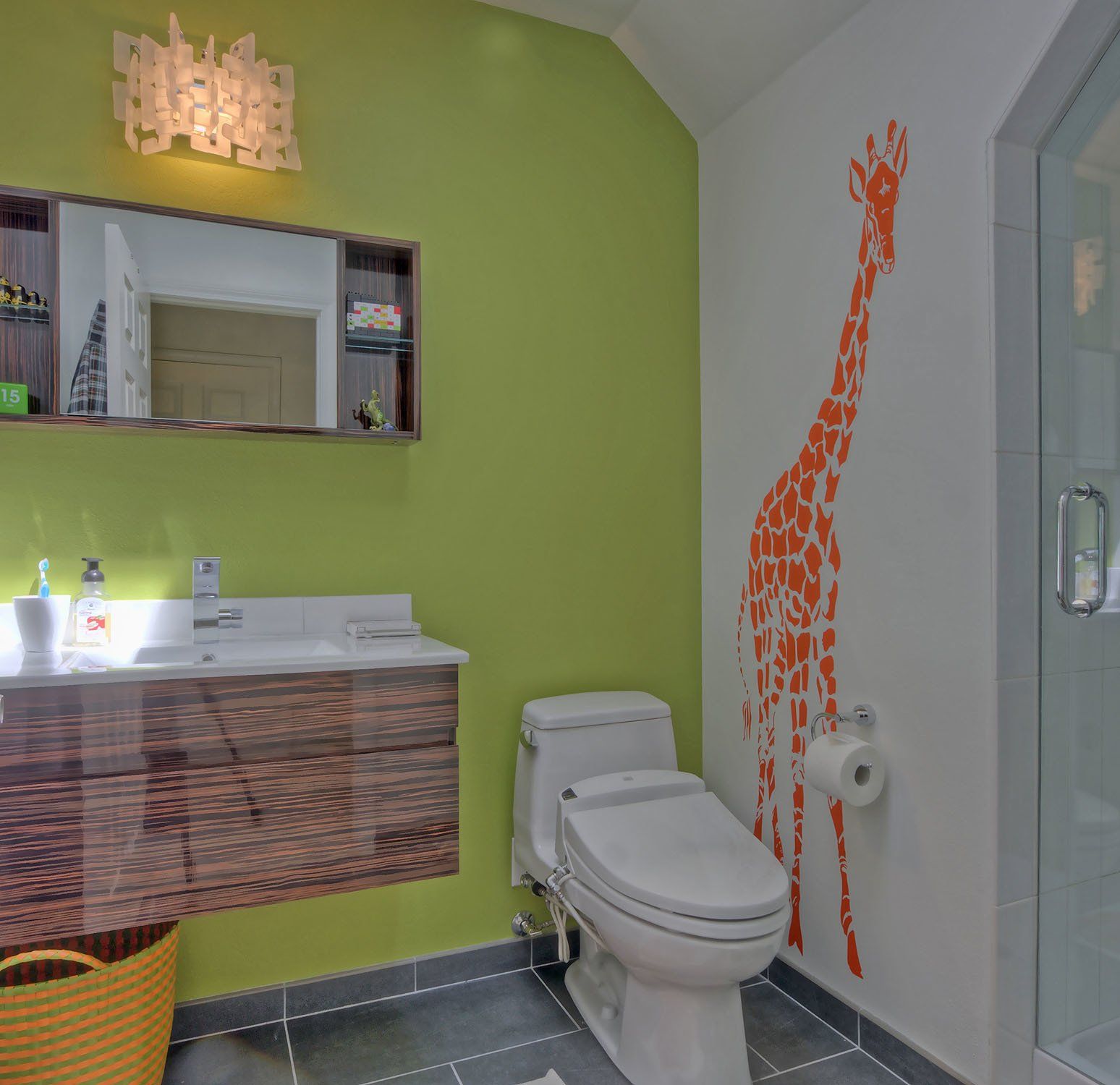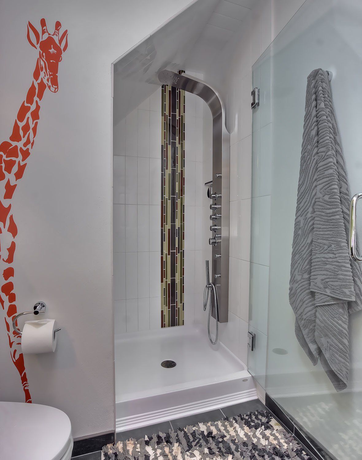 This bedroom is small and had a tiny existing closet and poor flow, so we had to get creative. We reworked the layout to allow for a walk in closet and replaced old carpet with bamboo flooring. By adding a loft bed, we gained a large custom desk space, complete with tool chest as desk storage. Since my client’s view of the ceiling got a little closer, we added interest with bold color and design. A contemporary dresser and comfortable reading chair round out the space. The existing bathroom had a leaking shower with odd angles. To save money, we kept the angles and added a European shower tower, maximizing luxury and function in a tight space. The wall mounted vanity is visually lighter than a traditional vanity and makes the room feel larger. And we can’t forget the giraffe – a fun and colorful accent for a true animal lover!